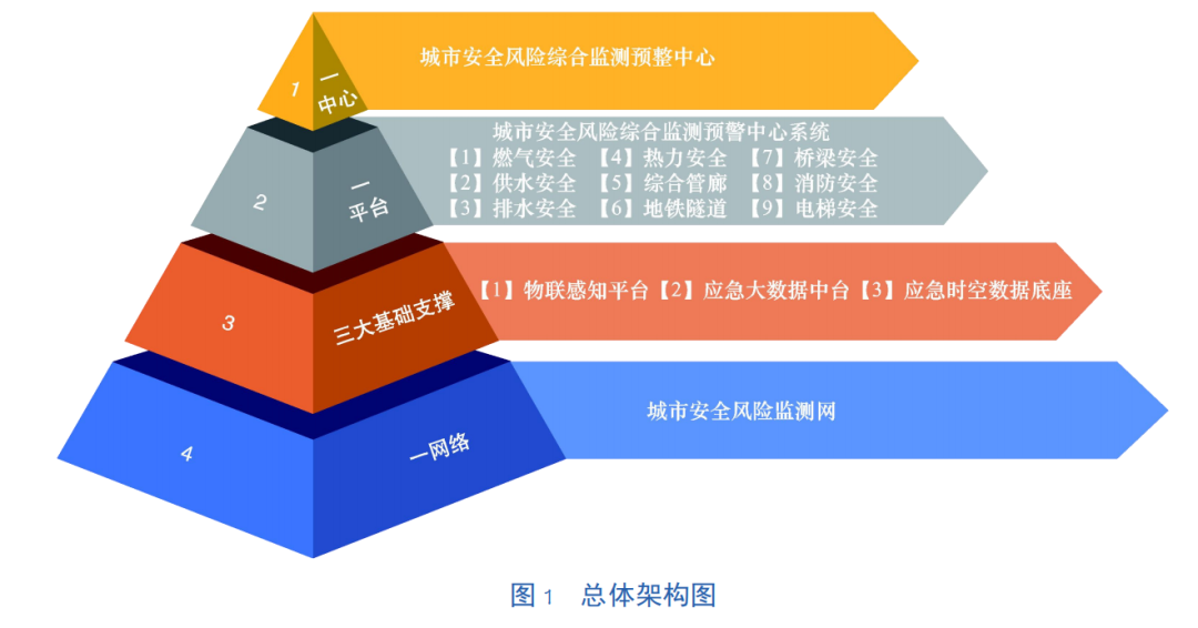 “一网”即城市安全风险监测感知网;“一中心”即城市安全风险综合监测预警中心;“一平台、广应用”即城市安全风险综合监测预警平台以及燃气、热力、供水、排水、桥梁、综合管廊、电梯等9大专题应用;“三大基础支撑”包括物联感知平台、应急大数据中台和应急时空数据底座。