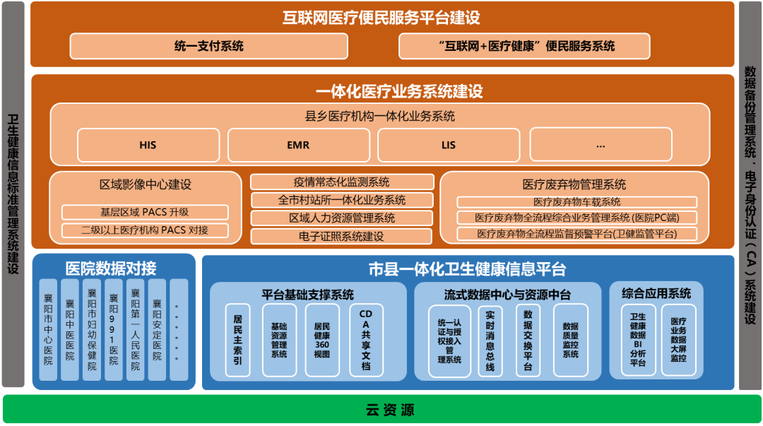 按照全国医院信息化建设标准与规范、全国基层医疗卫生机构信息化建设标准与规范,对全市二级及以下医院、乡镇卫生院(社区卫生服务中心)及村卫生室(社区卫生服务站)、个体诊所信息系统进行一体化、标准化建设,提高卫生健康信息化整体应用水平,建设符合现代医院管理制度的基于云架构模式的县乡一体化医院管理信息系统、一体化云模式村站所信息管理系统、打通现有公共卫生各业务条线,实现基础医疗公卫业务系统深度集成,数据互通。