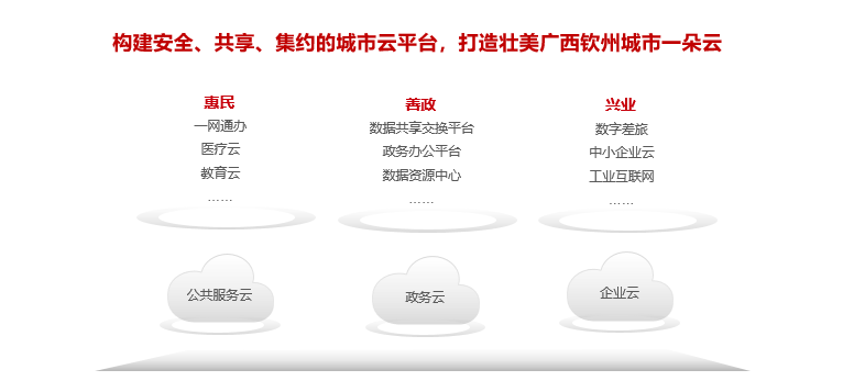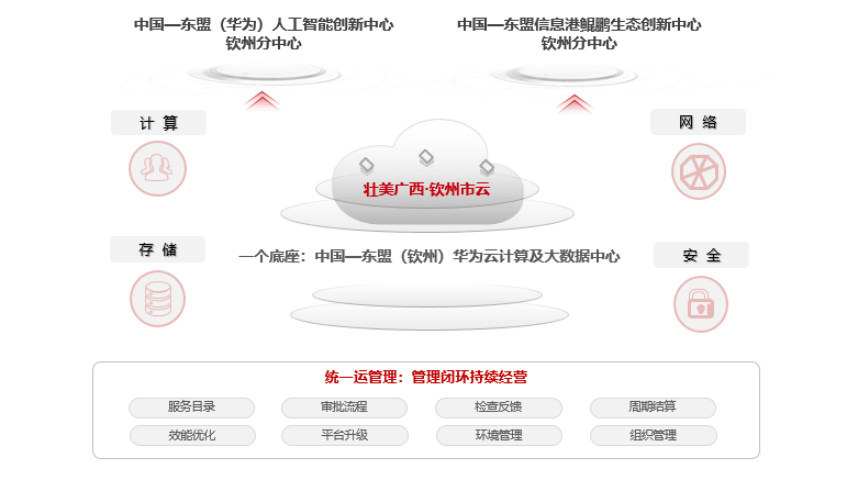 壮美广西·钦州市云经过多年的建设和发展,现已形成包含政务云、公共服务云、企业云三大模块的“城市一朵云”体系,接入N个多家技术路线异构的云平台服务商,接入统一资源管理平台,提供IaaS、PaaS、DaaS、SaaS、安全服务、专业支撑等六大类服务,并通过政务云统一门户,在网络管理、运维管理、安全管理和标准规范等四个体系的保障下,为全市政务云用户提供高效安全的云服务。打造了华为人工智能算力资源池,共部署了25张华为昇腾算力卡,为钦州市发展人工智能产业奠定扎实基础。