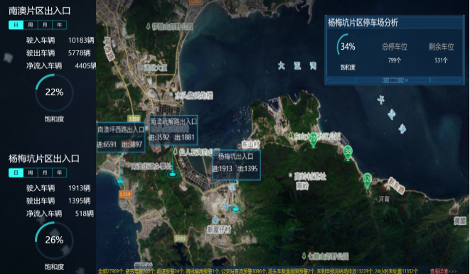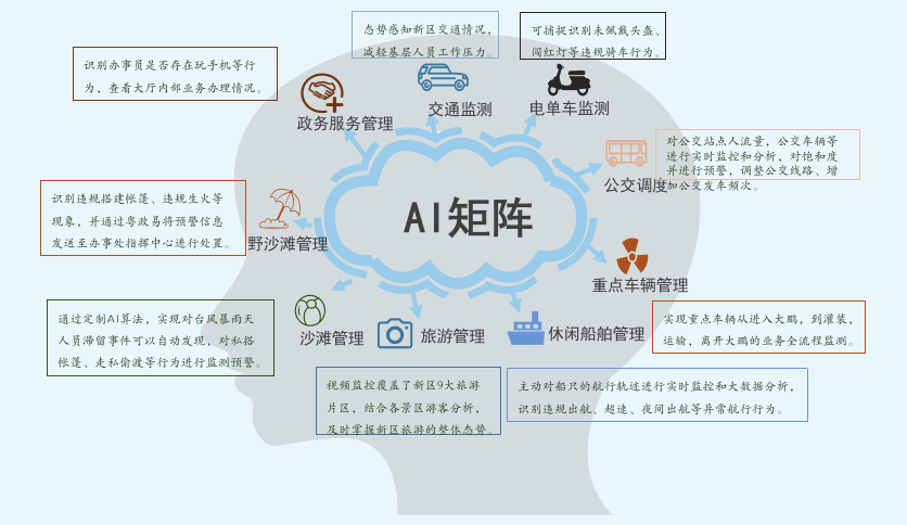 大鹏新区基于智慧大鹏运行指挥一体化平台汇聚整合公安雪亮工程、智慧旅游、三防、街道自建等视频,并聚焦业务部门工作痛点,在旅游交通领域先行尝试,逐步打造“视频+AI+应用场景”的集约化智慧大鹏精耕模式,目前已形成AI公交车调度、AI重点车辆管理、AI休闲船舶管理、AI交通监测、AI旅游管理、AI沙滩管理、AI野沙滩管理、AI政务服务管理等场景组成的AI“微改革、微创新”矩阵,在重要道路车流引导、旅游景区车流、停车、人流、沙滩安全预警、重点车辆安全管控(泥头车、危化品车和客运车等)、三防监控预警、政务服务评价等方面,为相关业务部门规范和引导相关对象行为提供有效的参考依据。