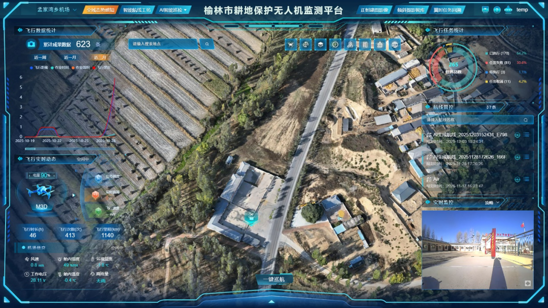 整合无人机作业全量数据、设备运行状态及现场环境指标,精准掌握作业资源与现场条件;覆盖飞行任务全生命周期状态统计与AI智能航线全流程管控,实现任务—航线一体化动态管理;结合数字化底座完成监测区域状态可视化呈现,为耕地保护精准化、智能化管理提供全域动态态势支撑,如图2所示。