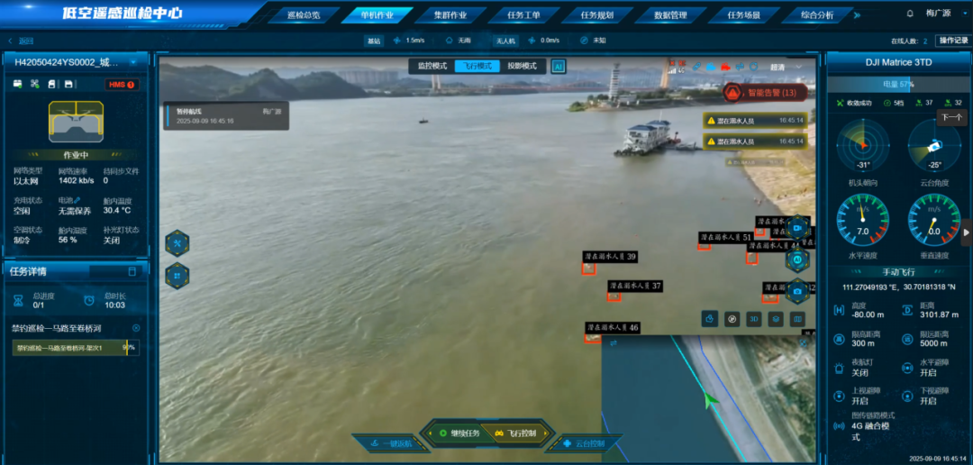 针对政务巡检“任务多、目标杂、场景差异大”的特点,构建动态多任务AI检测机制,实现“一次起飞、多项识别”。无人机在同一架次飞行中,可同时对禁捕禁钓人员与船只、施工变化与占道经营问题进行并行识别,如图4所示。避免传统模式中“一个任务一趟飞”的低效运行。