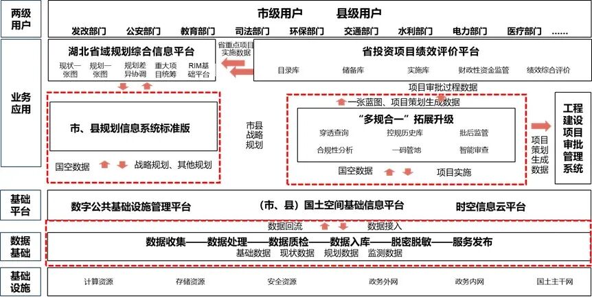 项目纵向深度对接国家、省级相关规划信息平台,横向联通湖北省投资项目绩效综合评价平台、襄阳市数字公共基础设施基础平台等业务平台,打破传统“信息孤岛”格局。通过搭建实时数据共享通道与业务协同接口,确保资源信息高效互通,避免数据重复采集与流程折返,实现多部门“一次录入、多方复用”,为襄阳“多规合一”落地提供了保障,也为同类项目跨系统对接提供了可复制的实践经验。