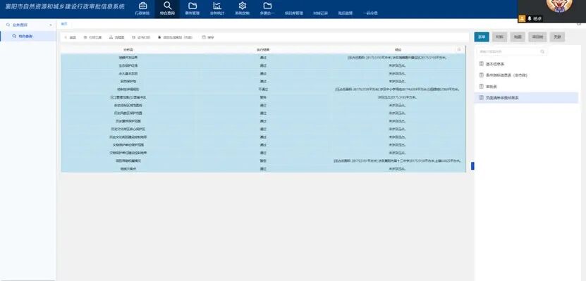针对行政审批业务(项目生成策划、用地规划条件、建设用地审批、临时用地、建设工 程方案审查、工程许可、矿业权登记审批等),梳理三区三线、自然保护区、规划管控、权属审查等审查要点,确定项目审查负面清单;在业务办理模块内,增加智能审查按钮,点击即可开展空间审查,展示项目审查结果;将负面清单审查结果反馈到项目审查表单内,作为业务审批过程中的环节之一,实现业务审批智能审查。