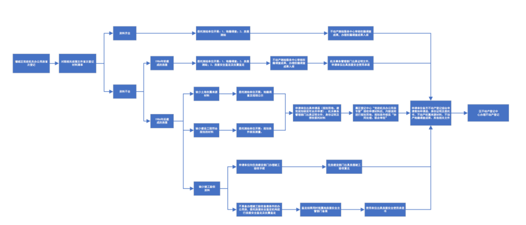 党政机关办公用房权属统一登记是规范国有资产管理、提升资源配置效率的重要基础性工作。近年来,国家多次强调党政机关办公用房的规范化管理,要求加快实现权属清晰、登记完备的目标。然而,由于历史遗留问题多、政策链条长、部门协同复杂,许多地区在推进过程中面临“登记难、流程乱、效率低”等挑战。增城区党政机关办公用房数量多、建成年代跨度大,部分建筑存在用地手续不全、规划核实缺失、宗地界限模糊等问题,导致登记工作推进缓慢,亟需创新工作模式破解难题。