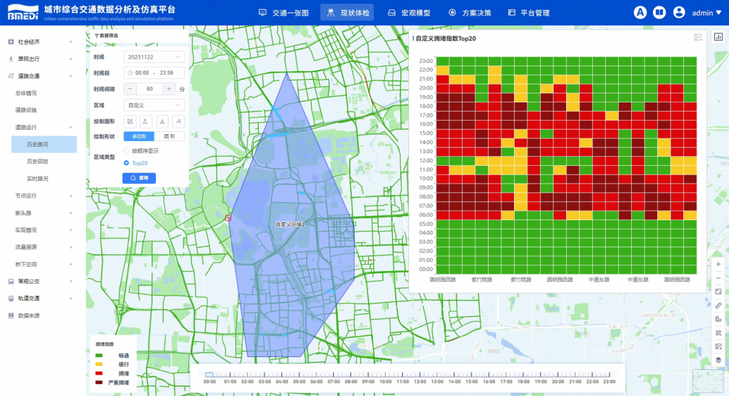 “现状体检”汇集十余类交通数据,从“社会经济、居民出行、道路交通、常规公交、轨道交通”五大维度进行综合指标分析,支持自定义区域查询与计算,为问题精准研判提供依据。