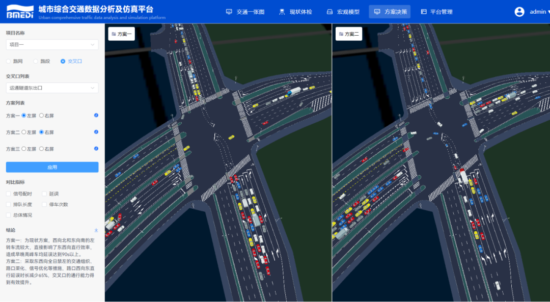 “方案决策”以中微观仿真技术为核心,集成方案对比、三维展示和运行监测等功能。能够实现多方案的同屏仿真展示和指标输出;融合BIM数据,提供多尺度、多视角、区域级三维数字孪生演示。同时,利用物联感知数据,实时监测交通运行状态,为运维决策提供直观的数据支持。