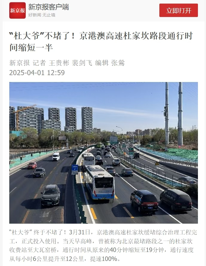 在社会效益方面,推动交通治理从 “经验判断” 向 “数据驱动” 转型,显著提升政府决策科学性与治理精细化水平。在京港澳高速杜家坎缓堵项目中,通过平台仿真优化,使通行时间从40分钟缩短至19分钟,平均速度提升100%,惠及大量通勤人群。