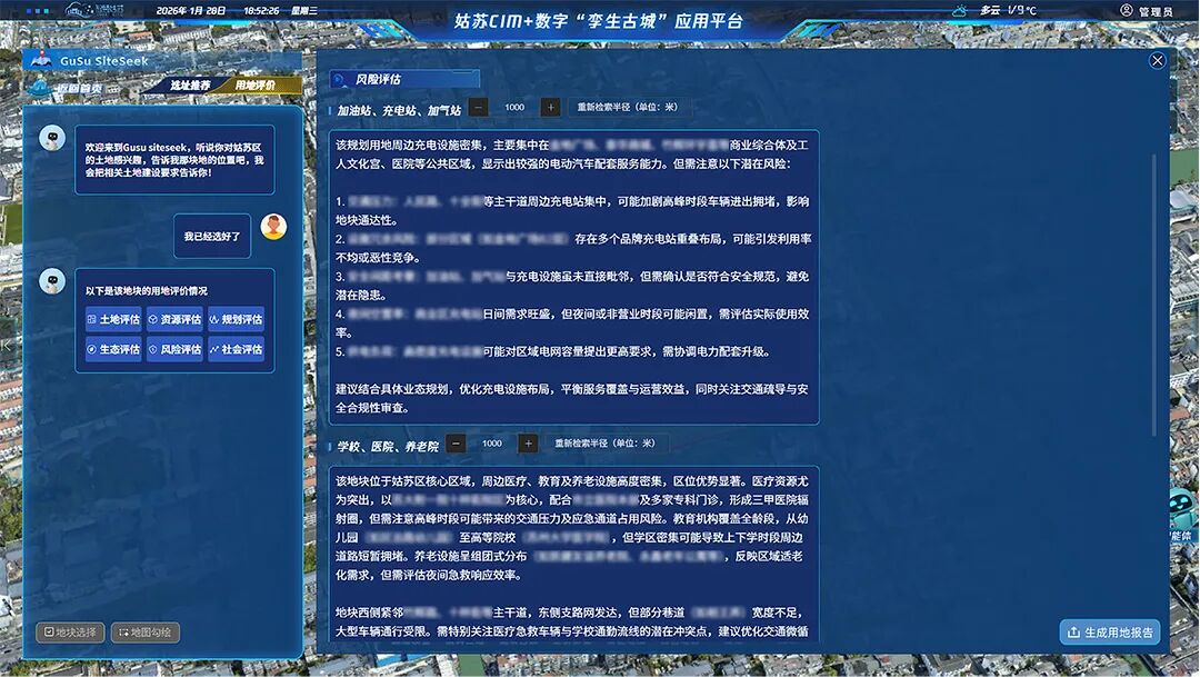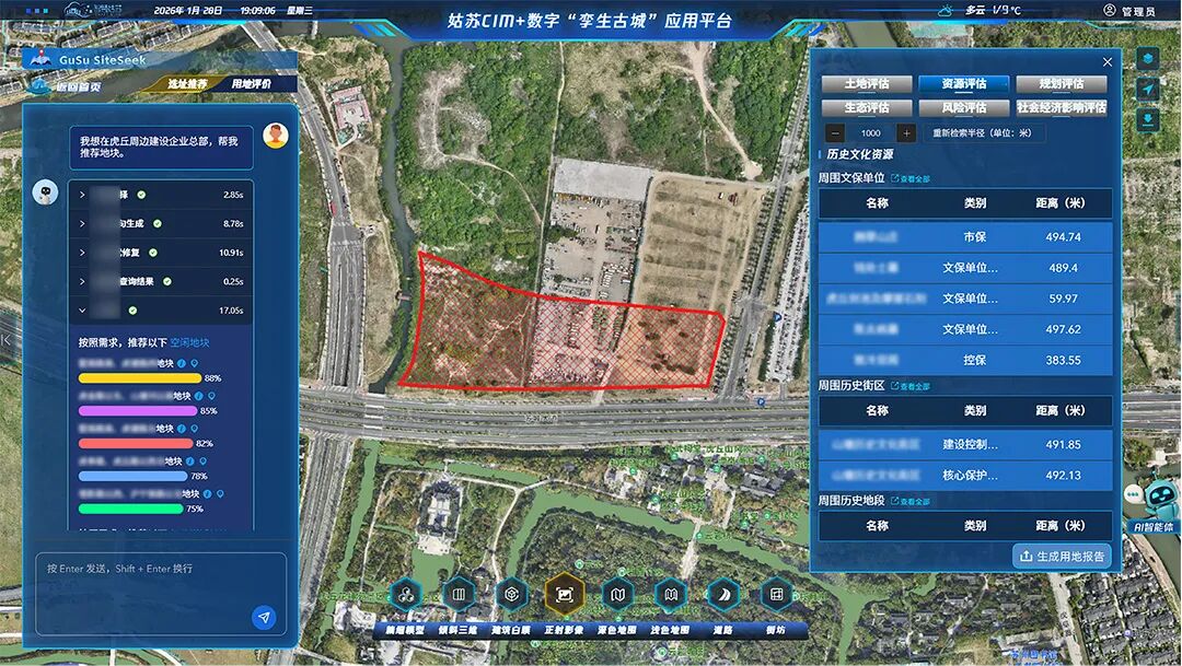 随着城市信息模型(CIM)与人工智能技术的快速发展,为破解选址痛点提供了技术支撑。姑苏CIM + SiteSeek重点项目选址平台顺势而生,依托技术创新与模式重构,以数据驱动替代经验依赖,构建全流程智能化选址体系,填补传统选址模式在精准度、效率性、系统性上的短板,助力城市实现资源优化配置与产业精准落地。