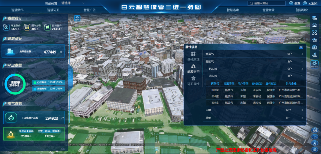 全面打造标准规范、信息准确、数据鲜活的城管业务标准地址库,以高精度三维场景为底座,融合电子地图、建筑白模等数据源,嵌入智慧城管燃气安检、环卫收费等多业务智慧应用,城市管理实时运行情况一屏可视、一网统管、一目了然,助力彻底根治城市管理难点顽疾。