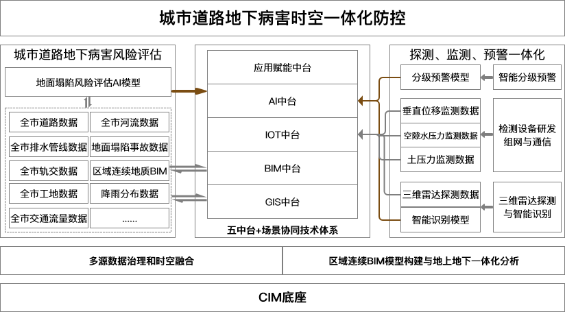 在国家推动“智慧城市”和“韧性城市”建设的背景下,住建部等部门自2020年起发布系列政策,要求建设城市信息模型(CIM)基础平台。2025年《中共中央 国务院关于推动城市高质量发展的意见》进一步提出,要打造集约统一、数据融合、高效协同的城市数字底座,完善CIM平台。CIM平台能够集成全空间、多尺度、多类型的城市数据,支撑从静态建模到动态感知、从单点分析到全局推演的综合应用,为道路塌陷提供了全链条智慧防控的新路径。