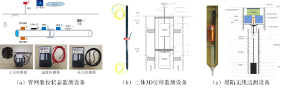 提出了全平面、全深度、全覆盖的道路病害探测体系,优化了探测技术;提出基于深度学习的3D GPR数据智能识别框架与“模型量化评估+交互验证”方法;研发智能探测识别技术。自主研发多种地表位移、土压力与孔隙水压力的微型监测装置,如图8; 建立多参数融合的监测与分级预警机制,建立基于统计规律的群体预警模型,研发道路塌陷智慧防控一体化平台,如图8。